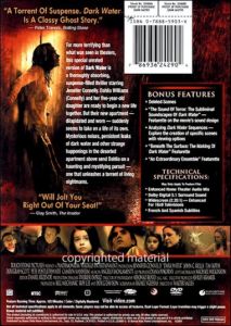 Deleted Scenes "The Sound of Terror: The Subliminal Soundscapes Of Dark Water" - Featurette on the movie's sound design Analyzing Dark Water Sequences - Explore the creation of specific scenes with viewing options "Beneath The Surface: The Making Of Dark Water" Featurette "An Extraordinary Ensemble" Featurette |