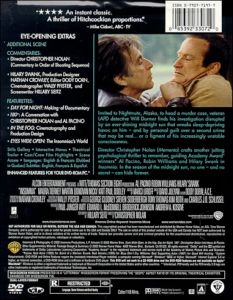 Additional Scene Commentary with Director Chris Nolan Commentary by Hilary Swank, Production Designer Nathan Crowley, Editor Dody Dorn, Cinematographer Wally Pfister and Screenwriter Hillary Seitz Featurettes: "Day For Night": The Making-Of Insomnia 180: A Conversation with Christopher Nolan and Al Pacino In the Fog: Cinematography and Production Design Eyes Wide Open: The Insomniac's World Stills Gallery Interactive Menus Theatrical Trailers Cast/Crew Film Highlights Scene Access Enhanced Features for your DVD-ROM PC